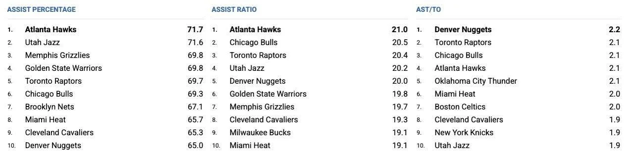 The underlying profile makes that result easier to understand. Atlanta leads the league with 1,456 total assists, and they sit at or near the top across every major passing efficiency measure. They rank first in assist percentage, meaning a higher share of their made baskets are created for someone else. They also rank first in assist ratio, which captures how often assists are generated per possession, not just per game. On top of that, they are tied for second in assist to turnover ratio.