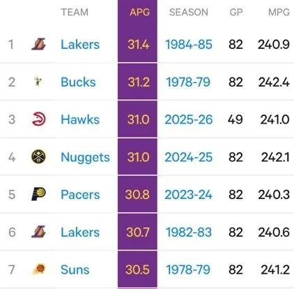 Most NBA teams average somewhere between 23 and 26 assists per game. The very best offenses might sniff 28. Crossing 30 is rare. Living above it is almost unheard of. And yet, 49 games into the season, the Atlanta Hawks are averaging 31.0 assists per game. That number is not just high. It is historically rare. Atlanta is operating at a level no team has sustained since the Showtime Lakers, who averaged 31.4 in 1984–85.
